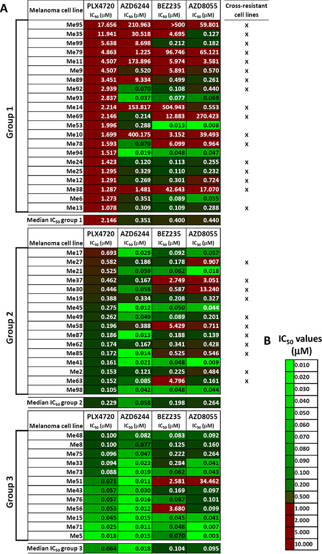 Figure 1: Responsiveness to BRAF-V600E-, MEK1/2- or PI3K/mTOR-specific inhibitors in BRAF-mutant melanoma cell lines. (A) Susceptibility to PLX4720 (BRAFV600E inhibitor), AZD6244 (MEK1/2 inhibitor), BEZ235 (dual PI3K/mTOR inhibitor) and AZD8055 (dual mTORC1/2 inhibitor), shown as IC50 values (μM), was assessed by a 72 h MTT assay in a panel of 49 melanoma cell lines. IC50 values obtained through non linear regression analysis of twelve-point dose-response curves spanning 4 logs of inhibitor concentrations. Melanomas were distinguished into three groups after ranking based on PLX4720 IC50 values (group 1: IC50 > 1 μM; group 2: IC50 > 0.1 μM but < 1 μM; group 3: IC50 ≤ 0.1 μM). (B) Color code used for highlighting differences in IC50 values in panel A.