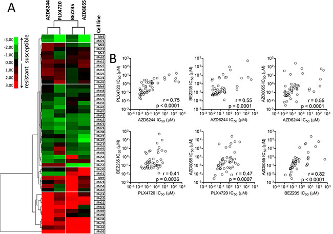 Figure 2: Responsiveness profiles of BRAF-mutant human melanoma cell lines to BRAFV600E-, MEK1/2-, and PI3K/mTOR-specific inhibitors are significantly correlated. (A) Hierarchical clustering of normalized and Log-transformed IC50 values for the indicated inhibitors in 49 melanoma cell lines. Each IC50 value (as listed in Figure 1) was normalized against the median IC50 value of each inhibitor in the whole panel. (B) Spearman correlation analysis of IC50 values for each of the six possible combinations of the four inhibitors in the whole panel of melanoma cell lines.