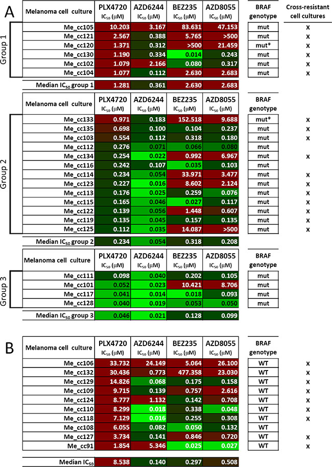 Figure 3: Responsiveness to BRAF-V600E-, MEK1/2- or PI3K/mTOR-specific inhibitors in short-term melanoma cell cultures. (A, B) Susceptibility to PLX4720, AZD6244, BEZ235 and AZD8055, shown as IC50 values (μM), was assessed as described in the legend to Figure 1, in a panel of 33 melanoma cell cultures (Me_cc) bearing mutant BRAF (n = 23, A) or wt BRAF (n = 10, B). Melanoma cell cultures were established from surgical specimens of lymph node metastases and were tested between the third and fifth in-vitro passage. Short term melanoma cell cultures from BRAF-mutant lesions were distinguished into three groups after ranking based on PLX4720 IC50 values as in Figure 1. BRAF genotype: mut: BRAFV600E; mut*: BRAFV600K WT. BRAF wild type. IC50 values were highlighted by the color code indicated in Figure 1B.