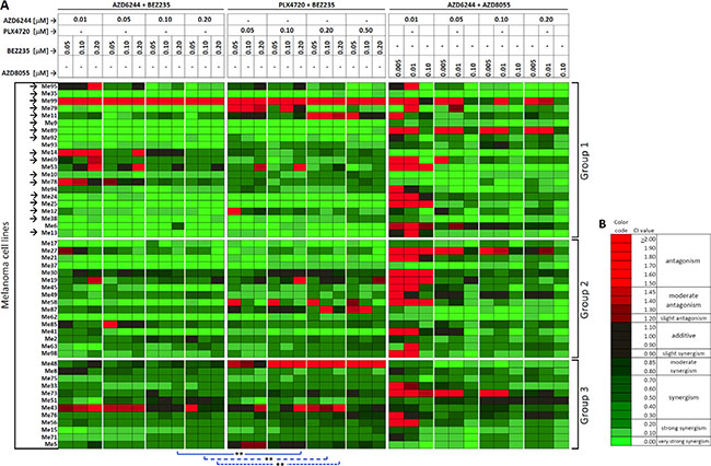 Figure 4: Synergistic drug interaction by co-targeting of MAPK and PI3K/mTOR pathways in melanoma cell lines. (A) Drug interaction analysis by the association of AZD6244 and BEZ235, PLX4720 and BEZ235, or AZD6244 and AZD8055 was carried out by the Chou-Talalay method in three groups of melanoma cell lines with different responsiveness to PLX4720 (Group 1, Group 2 and Group 3 as defined in Figure 1). Results for each of the indicated combinations of inhibitors (drug doses listed at the top of the Figure), for each cell line, are shown as Combination Indexes (CI) values by a color code shown in panel (B) Arrows: cell lines (n = 17) with a strong cross-resistant phenotype as in Figure 1. Blue lines: Wilcoxon matched pair test of CI values observed by AZD6244-BEZ235 vs. PLX4720-BEZ235 combinations having equivalent drug dosing. **p < 0.01. (B) color code for CI values, range of values and corresponding meaning (antagonism, additivity, synergy) according to ref. 24. Red indicates antagonism, green indicates synergism.