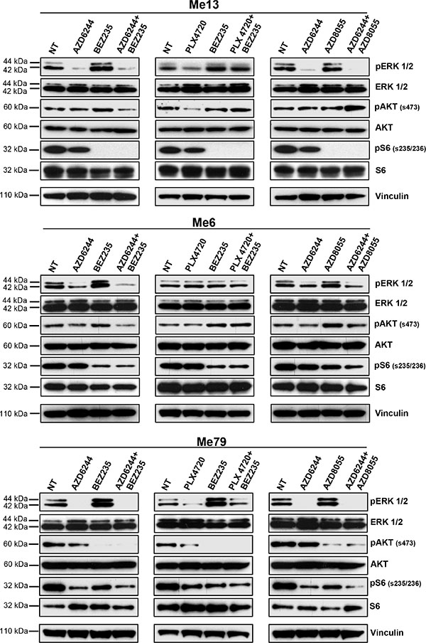 Figure 5: Inhibition of p-ERK and p-AKT by combinatorial treatments in melanoma cells with intrinsic resistance to PLX4720. Three melanoma cell lines from group 1 (Me13, Me6 and Me79) were treated O/N with AZD6244, BEZ235, PLX4720, AZD8055, or the indicated combinations, and then assessed by western blot for inhibition of relevant signaling molecules. Drug doses for Me13 and Me6 were: AZD6244: 0.1 μM; BEZ235: 0.1 μM; PLX4720: 0.5 μM; AZD8055: 0.1 μM. Drug doses for Me79 were 0.5 μM for all inhibitors.
