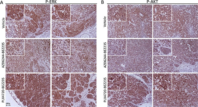 Figure 6: Inhibition of p-ERK and p-AKT in-vivo by combinatorial treatments in a PLX4720-resistant cell line. Immunohistochemistry analysis by staining with anti-p-ERK (A) and anti-pAKT (B) antibodies of tumor nodules (images of nodules from two animals are shown for each signaling molecule) removed after the last administration of inhibitors (day 31), from control mice (vehicle) and from mice treated with the association of AZD6244-BEZ235 or of PLX4720-BEZ235, as described in the legend to Supplementary Figure 5. Insets, higher magnification of a representative area of each panel highlighting the extent of staining for p-ERK and p-AKT in melanoma cells. Original magnification, 20x.
