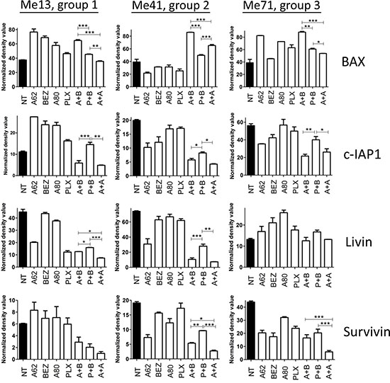 Figure 8: Modulation of pro- and anti-apoptotic proteins by combinatorial treatments. Expression of apoptosis-related proteins, by protein array screening, in Me13, Me41 and Me71 cells (representing each of three different susceptibility groups defined in Figure 1) at 48 hours of treatment with or without AZD6244 (A62), BEZ235 (BEZ), PLX4720 (PLX), AZD8055 (A80) and the combinations AZD6244-BEZ235 (A + B), PLX4720-BEZ235 (P + B) and AZD6244-AZD8055 (A + A). Inhibitors concentrations, tailored to the IC50 values of the three susceptibility groups, were: Group 1 (Me13): AZD6244 0.1 μM, BEZ235 0.1 μM, PLX4720 0.5 μM, AZD8055 0.3 μM; Group 2 (Me41): AZD6244 0.05 μM, BEZ235 0.1 μM, PLX4720 0.1 μM, AZD8055 0.1 μM; Group 3 (Me 71): AZD6244 0.05 μM, BEZ235 0.1 μM, PLX4720 0.1 μM, AZD8055 0.02 μM. Statistical analysis by ANOVA and SNK test. ***p < 0.001; **p < 0.01; *p < 0.05.