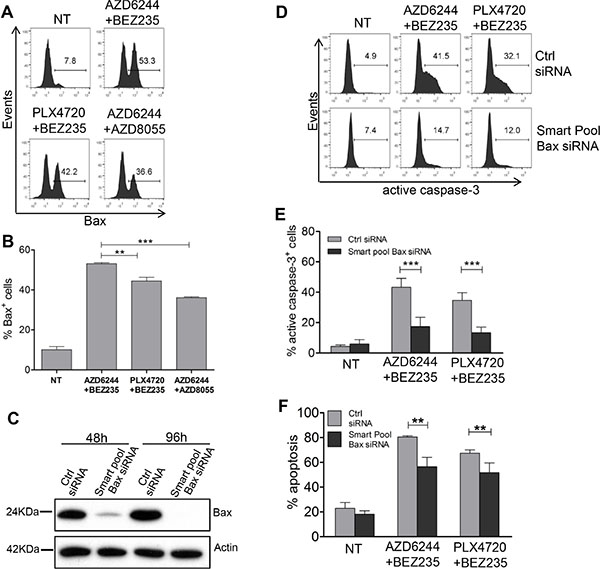 Figure 9: Role of Bax upregulation, by combinatorial treatments, in caspase-3 activation and melanoma apoptosis. (A, B) Me6 melanoma cells were treated for 24 h with the indicated associations of inhibitors and then stained with the Bax conformation-specific mAb 6A7. Inhibitors doses as in Figure 7. (B) Mean of three experiments. (C) Western blot analysis for Bax at 48 h and 96 h after transfection with Bax-specific Smart Pool siRNA or with the corresponding negative control siRNA. (D–F) Me6 cells, transfected with Bax-specific Smart Pool siRNA or with the negative control siRNA, were treated at 48 h with the AZD6244-BEZ235 or PLX4720-BEZ235 associations and analyzed at 96 h for active, cleaved caspase-3 (D, E) or for apoptosis (F). Numbers in each panel in A, D: % positive cells, markers set based on staining with secondary antibody only (A) or isotype control (D). Statistical analysis by ANOVA and SNK test (B) or two-way ANOVA and Bonferroni test (E, F). **p < 0.01, ***p < 0.001.