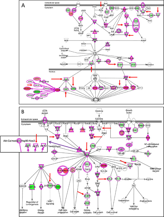 Figure 10: Selective modulation of genes in the ERK/MAPK and PI3K/AKT canonical pathways by AZD6244-BEZ235. (A, B) genes modulated in Me13 cells by AZD6244-BEZ235 treatment and belonging to the ERK/MAPK canonical pathway (A) and the PI3K/AKT canonical pathway (B). Upregulated genes are shown in red, and downregulated genes in green. Red arrows: genes differently affected by AZD6244-BEZ235 compared to PLX4720-BEZ235 and to AZD6244-AZD8055 treatments (see Supplementary Figure 16 for genes modulated by the latter two treatments).
