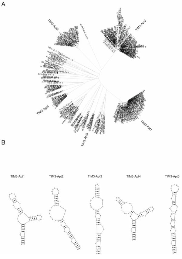 Figure 1: Major TIM3 aptamer families identified by HT-SELEX. A. The sequences of aptamer identified from round 6 were HT-sequenced by Ion Torrent, the sequencing alignment was performed with FASTAptamer software and then they were clustered by using the ClustalW. B. Secondary structure predicted by using RNAstructure of the five most abundant aptamer families.