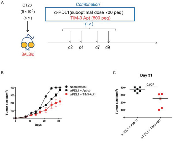 Figure 5: TIM3-Apt1 antagonizing aptamer enhances tumor-bearing mice in combination with PDL1 blockade. A. CT26 tumor colon carcinoma was implanted subcutaneously in Balb/c mice; at day 2, 4, 7, 9 upon tumor implantation mice were treated intravenously with PDL1-blocking antibody (10F.9G2) and the TIM3-Apt1 antagonizing aptamer and tumor volume was monitored by caliber measurement. B. Tumor growth kinetics of mice treated with anti-PDL1 antibody and TIM3-Apt1 or anti-PDL1 antibody with Apt-control. C. Tumor size at day 31 upon tumor implantation of the mice treated with PDL1 antibody and TIM-Apt1 blockade or just with anti-PDL1 antibody and Apt-control (p=0.007) (n=5-6 mice per group).