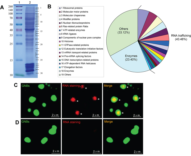 Figure 4: GNB is a highly complex nuclear protein structure with a RNA core A. Analysis of GNB proteins separated by SDS-PAGE. GNB proteins were separated by SDS-PAGE on a 12% polyacrylamide gel and stained with Coomassie blue (lane 2). Molecular masses of known proteins separated in the same gel are indicated on the left of the image (lane 1). B. Functional classes of 782 different proteins identified in proteomic analyses of purified GNBs from leukemia cells. C. RNA staining of GNBs with acridine orange (AO). All intact GNBs contained a RNA core (red) surrounded by a shell of GNBs. D. RNase treatment eliminated RNAs within GNBs.