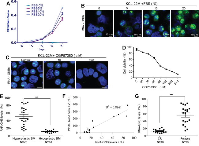 Figure 5: GNB abundance is positively correlated with cell proliferation, tumor burden and outcome of therapy in human leukemia A–B. A positive correlation exists between cell proliferation (A) and GNB levels (B). Kcl-22M cells were treated with the mitogen FBS at various concentrations for indicated times and then collected for analyses of cell proliferation by MTT and GNBs by immunofluorescence staining. C–D. Depletion of GNBs with the small molecule inhibitor CGP57380 inhibited proliferation of leukemia cells with a dose-dependent manner. Kcl-22M cells were treated with the indicated concentrations of CGP57380 for 72 h and then analyzed for GNBs by immunofluorescent staining(C) and Cell viability by MTT (D). E. RNA-GNB abundance was positively associated with the malignant proliferative potential of the bone marrow (BM) in patients with leukemia. ***P < 0.001. F. A positive correlation between RNA-GNB levels and peripheral white blood cell count were observed in leukemia patients (R2=0.89). Note: Normal blood cell count is below 1 × 109L. G. RNA-GNB abundance was associated with response to chemotherapies. ***P < 0.001.