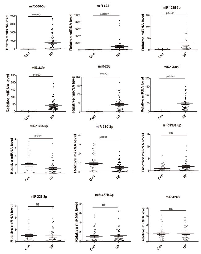 Table S8 provided baseline characteristics of the validation cohort. Based on the fold changes, qRT-PCR was performed to validate microarray results on 12 miRNAs, specifically miRNAs up-regulated in both heart and plasma (miR-660-3p, miR-665, miR-1285-3p and miR-4491), down-regulated in heart but up-regulated in plasma (miR-206 and miR-1268b), up-regulated in heart but down-regulated in plasma (miR-130-3p, miR-199a and miR-330-3p), down-regulated in both heart and plasma (miR-221-30, miR-487b-3p and miR-4288), were chosen for validation test in the plasma of 45 control and 45 CHF patients. Figure 2 showed the relative expression levels determined by qRT-PCR of each miRNAs. As a result, 8 of the 12 selected miRNAs (miR-660-3p, miR-665, miR-1285-3p, miR-4491, miR-206, miR-1268b, miR-130-3p and miR-330-3p) were successfully validated in the second cohort.