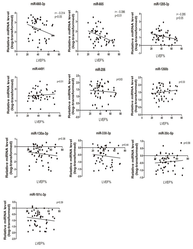 Further analysis were made in order to check the possible association between the circulating expression of the 10 successfully validated miRNAs and the clinical parameters from patients, which indicating the severity of CHF. Linear correlation analyses between miRNAs and the LVEF% were performed. Interestingly, as shown in Figure 4, we found significant correlations with LVEF% (P < 0.05) for 3 cardiac fibroblast-derived circulating miRNAs, namely miR-660-3p, miR-665 and miR-1285-3p, while the other miRNAs showed no significant correlation.