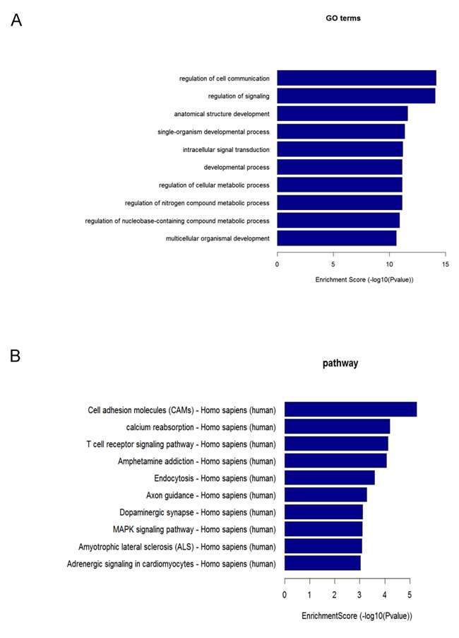 Figure 5: GO and pathway analysis of the 4 cardiac fibroblast-derived miRNAs. A. GO analysis based on differentially expressed miRNA target genes. The vertical axis is the GO category and the horizontal axis is the negative logarithm of p value (-Log p), that represents the significant level of GOs. B. Pathway analysis based on differentially expressed miRNA target genes. The vertical axis is the pathway category, and the horizontal axis is the negative logarithm of p value (-Log p), that represents the significant level of pathways.