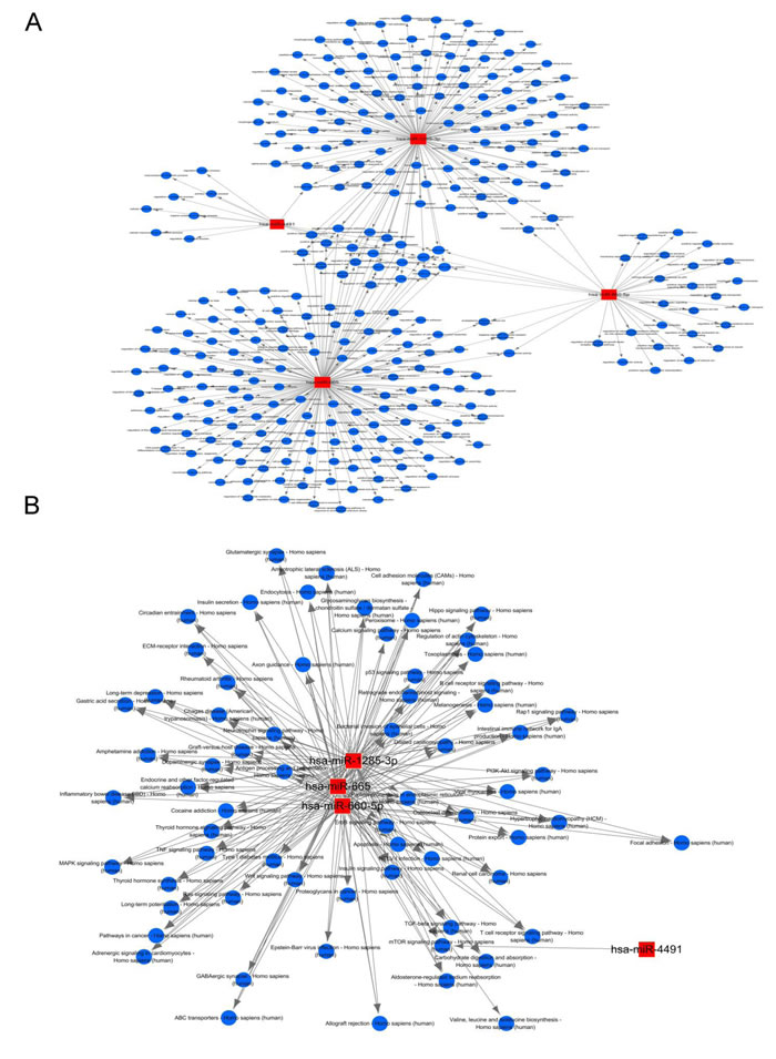 Figure 6: Functional network analysis of the 4 cardiac fibroblast-derived miRNAs. A. MiRNA-GOs-Network. Red box nodes represent miRNAs, and blue circular nodes represent genes. Edges show the inhibitory effect of microRNAs on GO related genes. B. Red box nodes represent miRNAs, and blue circular nodes represent pathways. Edges show the inhibitory effect of microRNAs on pathways.