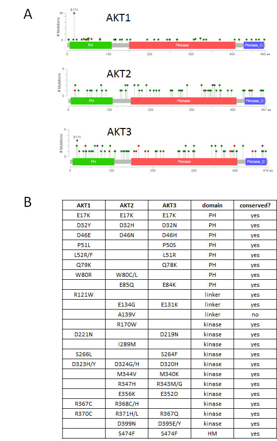 Figure 1: Spectrum of mutations in AKT1, AKT2, and AKT3. A. Figure and data derived from cBioPortal website [3]. Pleckstrin homology (PH), kinase, and C-terminal regulatory domains are depicted. Mutations are color coded by type: missense (green), nonsense (red). B. Recurrent mutations across AKT isoforms analyzed in this study. PH, pleckstrin homology. HM, hydrophobic motif.