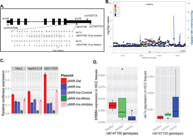 Figure 1. Genetic variants at the 3'UTR of ERBB4 are associated with decreased risk of hepatitis B virus (HBV) infection by regulating ERBB4 expression. (A) The location of the four potential functional SNPs are shown in the ERBB4 gene schematic map. Bioinformatics (MiRanda) predicted that the 12bp deletion at the 3'UTR of ERBB4 may interrupt the binding of miRNA let-7c. (B) A series of significant signals around rs1836724 was observed in the regional plot of the association between genetic variants and chronic HBV infection. The linkage disequilibrium values (r2) for the other SNPs are indicated by the heat scale. The direction of ERBB4 transcripts shown in arrows. (C) The sequence containing the 12bp deletion range of upstream 1000bp to downstream 1000bp was cloned to the reporter system (pMIR-Del), and the sequence containing the 12bp were also cloned and named pMIR-Ins. The pMIR-Del plasmid demonstrated lower luciferase expression levels than pMIR-Ins in HeLa, HepG2.2.15 and QGY7703 cell lines. let-7c mimic or inhibitor cotransfected with pMIR-Ins may decrease or increase the luciferase expression level, respectively. (D) HCC patients with different genotypes of the 12 bp variants exhibited different ERBB4 mRNA and let-7c level in HCC tissues (n=10).