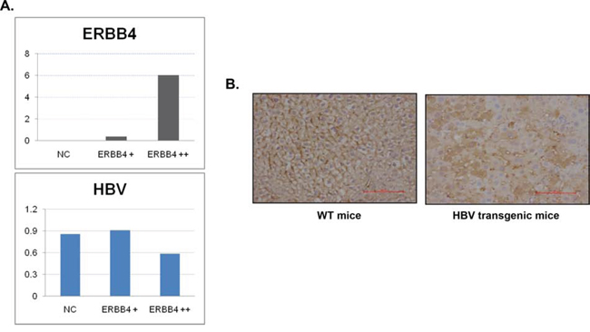 Figure 2. ERBB4 may play protective role in chronic HBV infection. (A) 48 h after ERBB4 over-expression, the expression of HBV mRNA significantly decreased (P<0.001). (B) Expression intensity and location of ERBB4 were shown in wild type mice (WT) and HBV transgenic mice (HBV) performed by immunohistochemistry.
