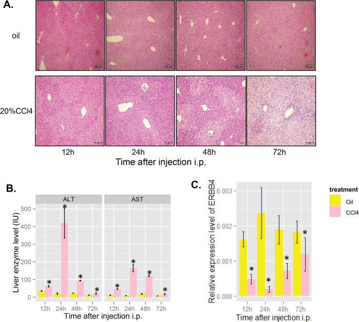 Figure 3. ERBB4 expression decreased initially and recovered after liver injury induced by acute carbon tetrachloride (CCl4) in mice. (A) Hematoxylin and eosin staining (H&E) of liver sections in mice after acute CCl4 administration. (B) Serum levels of alanine aminotransferase (ALT) and aspartate aminotransferase (AST) in mice after oil or CCl4 injection, respectively. (C) ERBB4 mRNA expression levels in mice liver after oil or CCl4 injection, respectively.