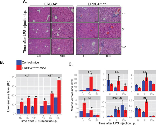 To further define the role of ERBB4 in hepatic inflammatory responses, we assessed induction of liver damage by LPS challenge in ERBB4-/-heart mice. Intraperitoneal LPS injection elicited more severe liver damage response in ERBB4-/-heart mice than in controls. H&E of liver sections also revealed increased inflammatory cell infiltration into hepatic parenchyma (Figure 4A). Also, liver cells damage was more severe in ERBB4-/-heart mice compared with those in ERBB4+/+ mice, as indicated by higher serum ALT and AST levels (Figure 4B). We measured local levels of inflammatory cytokines in the liver tissues at different time points following LPS injection, and detected higher levels of IFN, IL12, IL-6 and TNF in ERBB4-/-heart mice than in control mice three hours after LPS injection (Figure 4C), suggesting an enhanced inflammatory reaction in ERBB4-/-heart animals. These results from in vivo study suggested protective role of ERBB4 in acute liver injury.