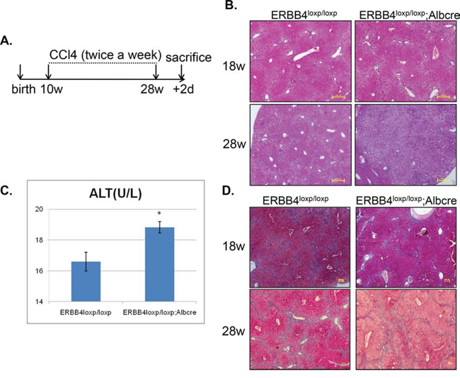 Figure 5. ERBB4 liver-specific knockout mice exhibited severe alterative inflammation after long term carbon tetrachloride (CCl4) administration. (A) Schematic depiction of experimental design. Mice were injected with CCl4 twice a week from postnatal week 10 to week 28, and were dissected 2 days after 28 weeks to examine liver injury. (B) Hematoxylin and eosin staining (H&E) staining of liver sections in liver-specific ERBB4 knockout and control mice at week 18 and week 28, respectively. (C) After sacrificing, serum ALT levels of liver-specific ERBB4 knockout and control mice were tested (n1=8, n2=8). (D) Masson staining of liver sections in liver-specific ERBB4 knockout and control mice at week 18 and week 28, respectively.