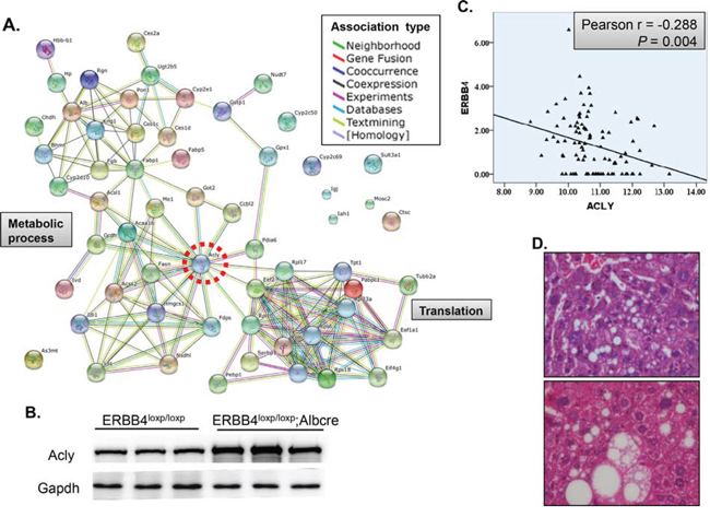 Figure 6. ACLY, an enzyme key for de novo lipogenesis, was negatively associated with ERBB4. (A) Protein-protein association of dysregulated proteins after liver-specific knockout of ERBB4. (B) Western blot validation in another three pairs of liver-specific knockout and control mice. (C) Negative association between ERBB4 and ACLY expression in liver tissues derived from The Cancer Genome Atlas (TCGA) database. (D) Lipid accumulation in liver sections of liver-specific ERBB4 knockout mice by hematoxylin and eosin staining (H&E).