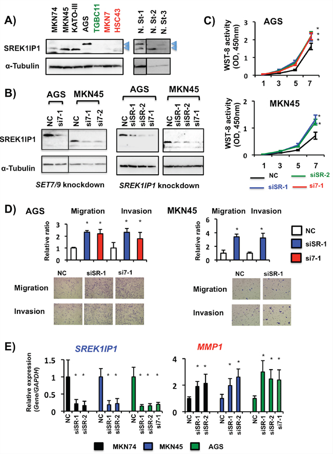 Figure 7: Effects of SREK1IP1 siRNA transfection in GC cells. A. Endogenous SREK1IP1 protein expression levels in seven GC cell lines and three non-cancerous stomach tissues. Although the size of SREK1IP1 protein is known to be 18kDa, two different sizes (approximately 18kDa and 20kDa, arrowheads) of SREK1IP1 protein were detected on WB. B. WB analyses of SREK1IP1 protein expression in AGS and MKN45 cells after SET7/9 (left, si7-1 and si7-2) and SREK1IP1 (right, siSR-1 and siSR-2) siRNA transfection. Knockdown of each gene inhibited expression of the predicted (18kDa) and large size (20kDa) proteins in MKN45 and AGS cells, respectively. C. Cell proliferation assays after SREK1IP1 knockdown in AGS and MKN45 cells. To compare the effects on SREK1IP1 and SET7/9, we also performed knockdown of SET7/9 (si7-1) in this study. Three independent assays of each knockdown were conducted. Representative data are shown and error bars indicate S.D. *P < 0.05. D. Matrigel cell invasion and migration assays of AGS and MKN45 cells. The total numbers of migrating and invading cells on the membrane in at least three fields were counted. The average (column) ± S.D (bar) of three independent experiments is indicated (*P < 0.01, top). Photographs show representative fields of migrating and invading cells on the membrane (bottom). E. The effects of SREK1IP1 knockdown by its siRNA transfection and the resultant MMP1 expression were quantitatively analyzed by qRT-PCR. The average (column) ± S.D (bar) of three independent experiments is indicated (*P < 0.01).
