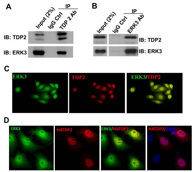 We attempted to elucidate ERK3 signaling by starting the identification of ERK3 interacting proteins. For this purpose, endogenous ERK3 protein complex in H460 lung cancer cells was analyzed by immunoprecipitation-mass spectrometry (IP-MS) following the procedures described in our previous study [20]. Among protein candidates identified (data not shown), TDP2, as a Tyrosyl DNA phosphodiesterase, caught our attention in particular. Interestingly, TDP2 was also identified as an interacting partner of ERK3 by Yeast-two-hybrid screening in a large-scale interactome analysis of cellular signalling proteins [21]. The interaction between ERK3 and TDP2 was validated by co-immunoprecipitation using a TDP2 antibody (Figure 1A) or an ERK3 antibody (Figure 1B) followed by Western blotting, and further verified by immunofluorescent double staining of ERK3 and TDP2 (Figure 1C and Figure 1D). Of note, ERK3 and TDP2 primarily co-localize in the nucleus.