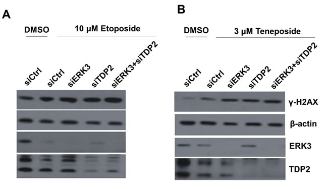 Figure 2: Knockdown of ERK3 and TDP2 increases H2AX phosphorylation (γ-H2AX) induced by Top2 inhibitors in H460 cells. Cells were transfected with siRNAs as indicated: non-targeting control siRNA (siCtrl), siRNA specifically targeting ERK3 (siERK3), or siRNA specifically targeting TDP2 (siTDP2). 48 hrs post-siRNA transfection, cells were treated with either etoposide, teneposide or DMSO vehicle control for 1.5 hrs. Cells were then harvested and protein lysates were analyzed by Western blotting using each specific antibody as indicated.