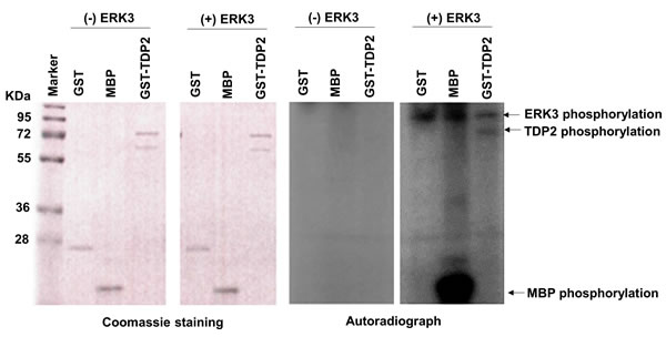 Figure 5: ERK3 phosphorylates TDP2 in vitro. 1 µg of Purified GST, Myelin basic protein (MBP), or GST-TDP2 protein (Coomassie staining, left two panels) was incubated with (+) or without (-) ERK3 protein kinase (30 ng). ERK3 autophosphorylation and phosphorylations of TDP2 and MBP (indicated by arrows) are seen in the autoradiograph of the fourth panel. GST and MBP serve as a negative target and a positive target of ERK3, respectively. Please note that: 1. While ERK3 autophosphorylation was seen in autoradiograph (Panel 4), ERK3 protein (~100 Kd) was not shown by coomassie staining (Panel 2) as only 30 ng of ERK3 protein was used in each reaction; 2. GST-TDP2 proteins were expressed as two forms and were shown as two bands by coomassie staining (Panels 1 and 2). However, only the upper band was phosphorylated by ERK3 in vitro (indicated by an arrow in Panel 4).