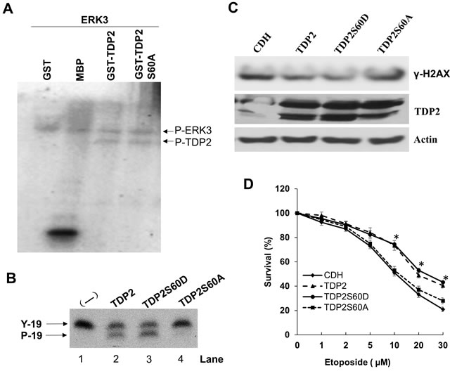 Active ERK3 kinase was expressed and purified in sf9 insect cells as described previously [18]. pGEX-2TK-TDP2, pGEX-2TK-TDP2S60A and pGEX-2TK-TDP2S60D were expressed in E. coli (BL21). GST-TDP2, GST-TDP2S60A and GST-TDP2S60D fusion proteins were purified using a GST-fusion protein purification kit (Invitrogen) following the manufacturer’s protocol.