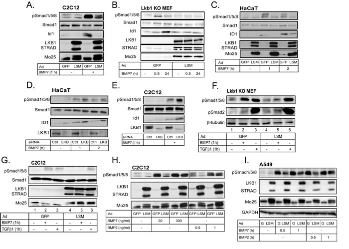 Figure 2: LKB1 suppresses BMP-induced phosphorylation of Smad1/5/8. A.-C. Immunoblot of endogenous phospho-Smad1/5/8, Smad1 and Id1 and of the three adenovirally expressed proteins of the LSM complex in extracts of C2C12 (A), Lkb1 KO MEF (B) and HaCaT (C) cells after stimulation with BMP7 (30 ng/ml) for the indicated time periods. D., E. Immunoblot of endogenous phospho-Smad1/5/8, Smad1, ID1 and LKB1 in extracts of HaCaT (D) and C2C12 (E) cells after transfection of the indicated siRNAs and stimulation with BMP7 (30 ng/ml) for the indicated time periods. F. Immunoblot of endogenous phospho-Smad1/5/8, phospho-Smad2 and β-tubulin proteins in Lkb1 knockout MEF extracts after adenoviral infection and stimulation with BMP7 (30 ng/ml) or TGFβ1 (5 ng/ml) for 1 h. G. Immunoblot of endogenous phospho-Smad1/5/8 and Smad1 proteins and of the three adenovirally expressed proteins of the LSM complex in C2C12 extracts after stimulation with BMP7 (30 ng/ml) or TGFβ1 (5 ng/ml) for 1 h. H. Immunoblot of endogenous phospho-Smad1/5/8 and adenovirally expressed LSM proteins in extracts of C2C12 cells after infection and stimulation with the indicated concentrations of BMP2 and BMP7 for 1 h. I. Immunoblot of endogenous phospho-Smad1/5/8, GAPDH (loading control) and adenovirally expressed LSM proteins in extracts of A549 cells after infection and stimulation with BMP7 (30 ng/ml) or BMP2 (10 ng/ml) for the indicated time periods.