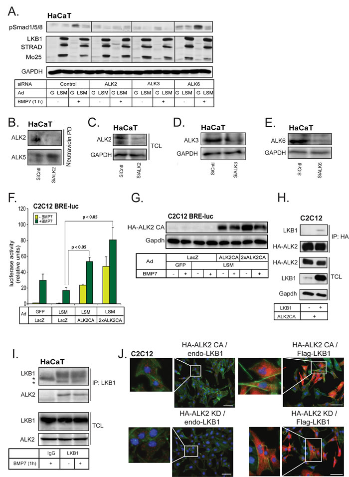 Figure 3: LKB1 crosstalks and interacts with BMP type I receptor. A. Immunoblots of endogenous phospho-Smad1/5/8, GAPDH (loading control) and adenovirally expressed LSM proteins in HaCaT extracts after transfection with the indicated receptor siRNAs and stimulation with 30 ng/ml BMP7 for 1 h. B., C. Immunoblots measuring total (C) and cell surface expression (B) of endogenous ALK2 in HaCaT cells after transfection with the ALK2 receptor siRNA. After cell surface biotinylation, the surface proteins were pulled-down (PD) with neutravidin prior to immunoblot analysis. GAPDH serves as a loading control for total cell lysates (C) and ALK5 as control for biotinylated cell surface fractions (B) and lack of off-target effects of the siRNA. D., E. Immunoblots measuring total expression of endogenous ALK3 (D) and ALK6 (E) in HaCaT cells after transfection with the respective receptor siRNA. GAPDH serves as a loading control. F. Luciferase assay in C2C12 cells stably expressing BRE2-luc reporter and stimulated with 30 ng/ml BMP7 for 24 h after infection with the indicated adenoviral vectors. The luciferase activity was normalized to the corresponding β-galactosidase activity. One specific dose and twice as much (2×) of the ALK2 CA virus were used for infection. Statistical significance at p < 0.05 between the marked measurements is indicated. G. Immunoblot of adenovirally expressed constitutively active (CA) ALK2 receptor and Gapdh (loading control) in C2C12 BRE2-luc extracts analysed in panel F. H. Co-immunoprecipitation assay of HA-tagged ALK2 with LKB1 in transfected C2C12 cells. HA antibody was used to pull down ALK2, and Gapdh blot indicates equal protein amounts in the total cell lysates (TCL). I. Co-immunoprecipitation assay of endogenous LKB1 with endogenous wild-type ALK2 receptor in the absence (-) or presence (+) of BMP7 stimulation for 1 h in HaCaT cells. Extracts were immunoprecipitated with LKB1 antibody or control mouse IgG and immunoblotted for ALK2 and LKB1. Total cell lysates (TCL) were immunoblotted with the same antibodies. Stars indicate the respective heavy immunoglobulin protein bands used for immunoprecipitation. J. Immunocomplexes (red dots) detected using proximity ligation assay in C2C12 cells using anti-HA and anti-LKB1 antibodies. Green color represents the actin cytoskeleton stained with phalloidin to mark overall cell morphology and integrity, and blue color represents nuclear staining with Hoechst. Cells were transduced with constitutively active ALK2 (top left), kinase-dead ALK2 (bottom left), both constitutively active ALK2 and LKB1 (top right), or both kinase-dead ALK2 and LKB1 (bottom right). Bars indicate 10 µm and insets show higher magnification of selected details.