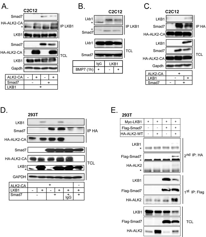Figure 5: LKB1 and Smad7 associate with ACVR1/ALK2. A. C2C12 cells adenovirally expressing different combinations of LKB1, constitutively active ALK2 and Smad7 proteins were lysed and immunoprecipitated with anti-LKB1 antibody and immunoblotted for Smad7, HA tagged ALK2 and LKB1. Total cell lysates (TCL) were immunoblotted with the same antibodies and antibody against Gapdh, as a loading control. A star indicates a non-specific protein band. B. Co-immunoprecipitation assay of endogenous LKB1 with endogenous Smad7 in the absence (-) or presence (+) of BMP7 stimulation for 1 h in C2C12 cells. Extracts were immunoprecipitated with LKB1 antibody or control mouse IgG and immunoblotted for Smad7 and LKB1. Total cell lysates (TCL) were immunoblotted with the same antibodies. Stars indicate the heavy immunoglobulin protein band used for immunoprecipitation. C. Co-immunoprecipitation assay using C2C12 lysate and anti-HA antibody pull-down. Cells were adenovirally expressing combinations of constitutively active ALK2 receptor, LKB1 and Smad7 and immunoblotted as in panel A. D. HEK-293T cells were transfected with constitutively active ALK2 receptor, LKB1 and Smad7; the cell lysates were immunoprecipitated with HA antibody or control mouse IgG and immunoblotting was done as in panel A. E. Immunoblots of LKB1, Smad7 and wild-type ALK2 after sequential immunoprecipitation (2nd IP) from cell lysates of transfected HEK-293T cells along with total cell lysate (TCL) immunoblots. The lysates after the first immunoprecipitation (1st IP) are also immunoblotted. First immunoprecipitations were incubated with Flag peptide and the eluted proteins were re-precipitated with the anti-HA antibody against HA-tagged ALK2. Stars indicate non-specific protein bands.