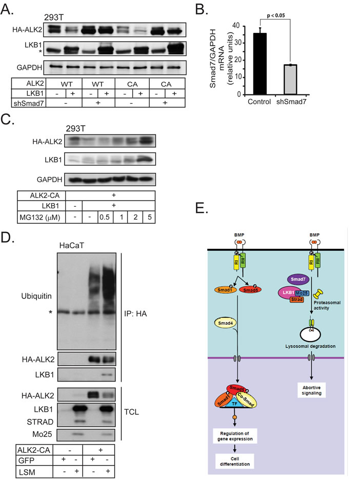 Figure 6: Smad7 is required for BMP type I receptor degradation by LKB1. A. HEK-293T cells were transfected with HA-tagged wild-type (WT) and constitutively active (CA) ALK2 together with LKB1 and short hairpin RNA targeting Smad7. Cell lysate was immunoblotted with HA and LKB1 antibodies; GAPDH was used as a loading control. A star indicates a non-specific protein band. B. Smad7 mRNA expression as determined by real time PCR, as a control for Smad7 knock-down efficiency in panel A. The silenced mRNA is shown in a grey bar. Statistical significance at p < 0.05 between the marked measurements is indicated. C. Immunoblot from HEK-293T cells transfected with constitutively active (CA) ALK2 and LKB1, treated with vehicle (-) or MG132 (doses as indicated). Immunoblotting for GAPDH served as loading control. D. Ubiquitinylation assay of transfected HA-tagged ALK2-CA together with GFP or LSM in HaCaT cells lysates after immunoprecipitation (IP) of the transfected receptor (anti-HA antibody) followed by immunoblot for endogenous ubiquitin and transfected HA-ALK2 CA and LKB1. Total cell lysates are immunoblotted with the same antibodies. A star shows the immunoglobulin heavy chain band used for immunoprecipitation. E. LKB1 inhibits BMP receptor type I signaling. Normal BMP receptor signaling via the complex of ligand, type II receptor (RII) and type I receptor (RI) leads to Smad1 and Smad5 phosphorylation (Smad8 is omitted for simplicity) and nuclear complex accumulation together with Smad4. The nuclear Smad complex with transcription factors (TF) regulates gene expression and drives cell differentiation. The ternary complex of LKB1, STRADα and Mo25 together with Smad7 promote proteasomal and lysosomal degradation of BMP type I receptors leading to suppression of BMP signaling.