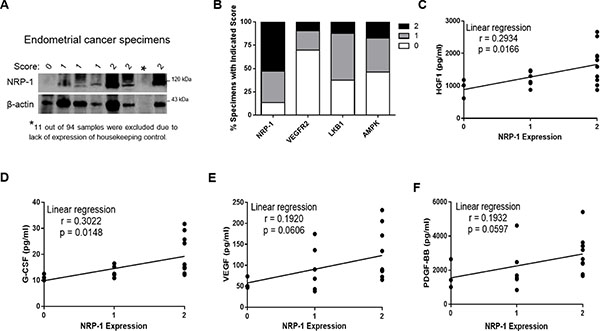 Figure 1: Association of NRP-1 with tumor-enhancing cytokines in endometrial cancer specimens. (A) Example Western blots of NRP-1 expression in patient tumors. (B) Percentage of specimens exhibiting 0, 1 or 2 stain scores for the indicated biomarkers. Specific protein expression in clinical endometrial cancer specimens were normalized, and intensities scored as high (2), moderate (1) or negligible/undetected (0). (C–F) measurement of various tumor-enhancing cytokines by ELISA revealed significant HGF and G-CSF serum levels in patients with NRP-1 positive versus negative endometrial cancer using the Mann-Whitney test. Although VEGF and PDGF-BB showed a similar trend, the values were not significant.