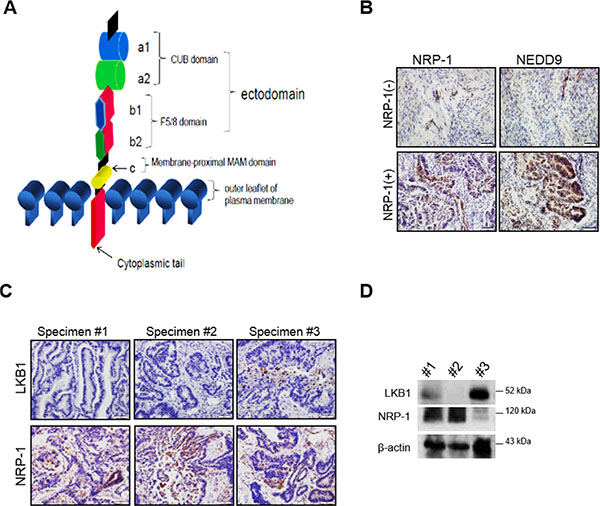 Figure 2: NRP-1 expression positively correlates with metastasis-enhancing NEED9 in human endometrial cancer specimens. (A) Illustration depicts NRP-1 transmembrane protein structure. (B) Representative immunohistochemistry (IHC) data of NRP-1 and NEDD9 expression in NRP-1 positive and negative endometrial cancer specimens. NRP-1 expression positively correlates with NEDD9 gene. (C and D) Representative IHC and biochemical data demonstrate inverse correlation between LKB1 and NRP-1 expression in endometrial cancer specimens.