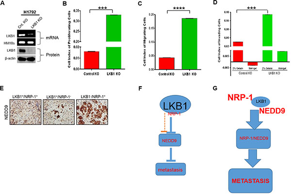Figure 3: LKB1-deficiency promotes metastatic behavior of cancer cells, and increased NRP-1/NEDD9 expression. (A) Stable LKB1 (mRNA and protein) knockout (KO) in H1792 cells. (B–D) LKB1 inhibits tumor-promoting phenotypes. (B) LKB1-expressing H1792 cells demonstrate decreased proliferation compared to LKB1-deficient cells. (***P < 0.001). P values correspond to one way ANOVA with Bonferroni’s Multiple Comparison Test. n = 3. (C and D) LKB1-expressing cells also exhibit decreased migration and invasion across matrigel or a 2% gelatin basement membrane matrix. (E) IHC data of mice tumor xenograft confirm increased expression of NEDD9 in NRP-1 + / LKB1- H1792 cell implants. (F) In the presence of LKB1, the expressions of NRP-1 and NEDD9 are abrogated, and correlate with decreased metastatic potential of cancer cells. (G) LKB1-deficiency correlates with aberrant NRP-1 and NEDD9 expression which enhance the metastatic potential of cancer cells.