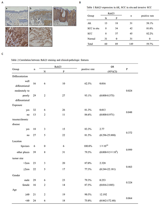 Figure 1: Rab23 was upregulated in AK, SCC in situ and invasive SCC. A. The immunohistochemistry assay of Rab23 expression in AK, SCC in situ and invasive SCC. a. Rab23 proteins were absent in normal epidermis or dermis. b. Rab23 was distributed in basal layer and lower spinous layer in AK lesion. c. Positively stained cells were distributed in the full-thickness epidermissquamous atypia of SCC in situ. d. Strong staining was observed in the moderately to poorly differentiated tumors. e. Rab23 staining was observed at the base of well-differentiated tumor. No staining was observed in the well-differentiated keratinocytes or keratin pearls in well-differentiated tumors. B. Rab23 expression in AK, SCC in situ and invasive SCC. C. Correlation between Rab23 staining and clinical-pathologic features.