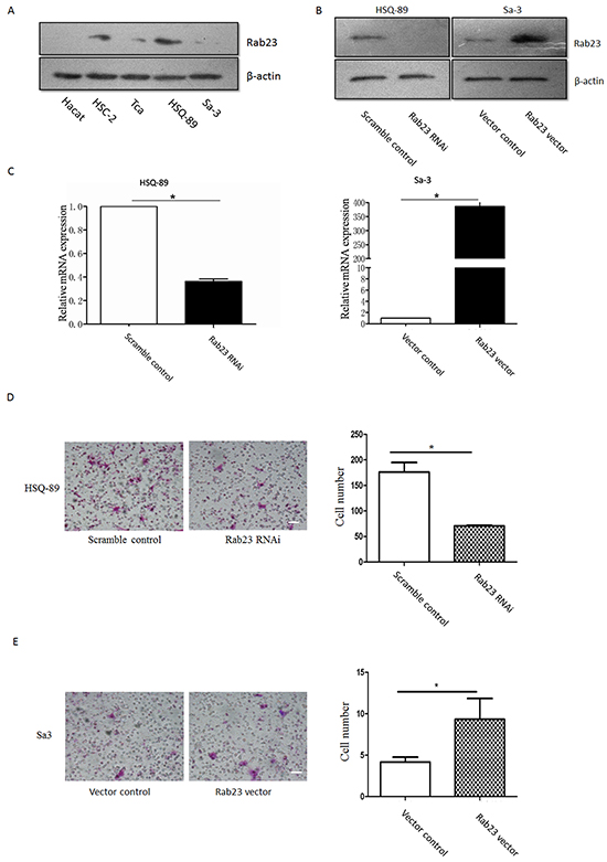 Figure 2: Rab23 promoted squamous cell carcinoma cells migration and invasion. A. Hact, HSC-2, Tca, HSQ-89 and Sa3 cells were lysed, western blotting was used to detected the protein expression of Rab23. HSQ-89 cells were transfected with scramble or Rab23 siRNA, Sa3 cells were transfected with control vector or Rab23 overexpression vector, then the expression of Rab23 protein was detected by western blotting B., the expression of Rab23 mRNA was detected by qPCR C. D. Invasive migration of HSQ-89 cells transfected with scramble or Rab23 siRNA (left), Quantification of the Transwell invasion assay (right), data is presented as the mean ± SEM; P values were calculated using the Student’s t-test, *P < 0.05. E. Invasive migration of Sa3 cells transfected with control vector or Rab23 overexpression vector (left), Quantification of the Transwell invasion assay (right), data is presented as the mean ± SEM; P values were calculated using the Student’s t-test, *P < 0.05.