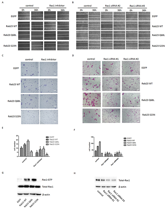 Figure 5: Rab23-promoted squamous cell carcinoma cells migration and invasion requires activation of Rac1. A. Representative images of the wound healing assay with Sa3 cells expressing EGFP, Rab23 WT, Rab23 Q68L and Rab23 S23N after Rac1 inhibitor treatment. B. Representative images of the wound healing assay with Sa3 cells expressing EGFP, Rab23 WT, Rab23 Q68L and Rab23 S23N after Rac1 siRNA transfection. C. Invasive migration of Sa3 cells expressing EGFP, Rab23 WT, Rab23 Q68L and Rab23 S23N after Rac1 inhibitor treatment. Bar = 100 μm. D. Invasive migration of Sa3 cells expressing EGFP, Rab23 WT, Rab23 Q68L and Rab23 S23N after Rac1 siRNA transfection. Bar = 200 μm. E. Quantification of the Transwell invasion assay in C, data is presented as the mean ± SEM; P values were calculated using the Student’s t-test, *P < 0.05. F. Quantification of the Transwell invasion assay in D, data is presented as the mean ± SEM; P values were calculated using the Student’s t-test, *P < 0.05. G. Levels of active GTP-bound Rac1in Sa3cells expressing EGFP, Rab23 WT, Rab23 Q68L and Rab23 S23N were detected by GSTpull down assays, as described in the materials and methods. Total Rac1 present in the lysates were analysed by immunoblotting with anti-Rac1 antibody. H. Quantification of Rac1 protein expression by western blotting in Sa3 cells transfected with Rac1 siRNA.