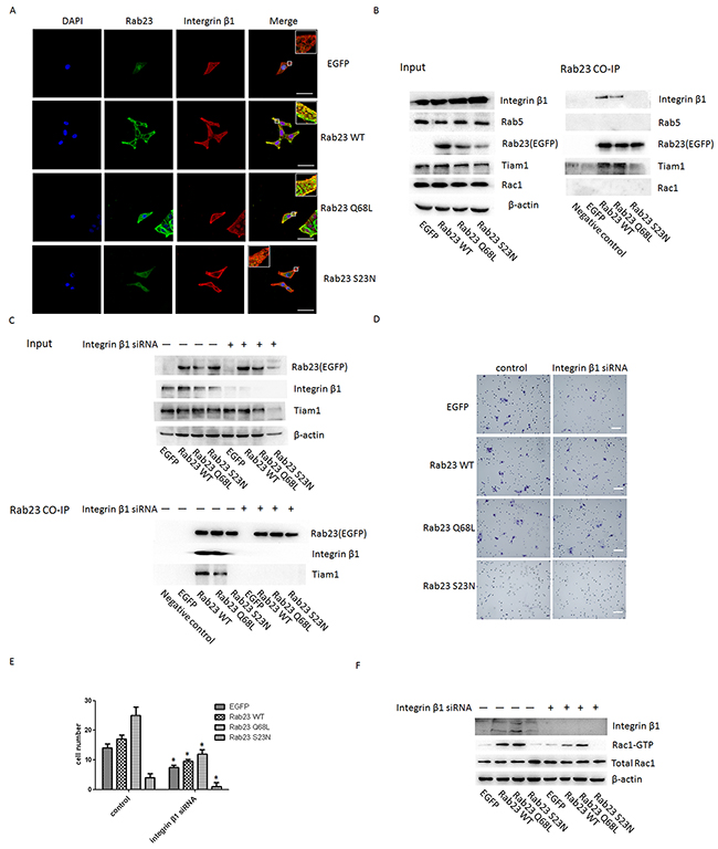 Figgure 6: Rab23 regulates Rac1 by directly associating with integrin-β1 in a GTP- dependent manner. A. Sa3 cells expressing EGFP, Rab23 WT, Rab23 Q68L and Rab23 S23N were stained with integrinβ1 (red) and DAPI (blue), respectively. Bar = 50 μm. B. Sa3 cells expressing EGFP-Rab23 WT, EGFP-Rab23 Q68L, EGFP-Rab23 Q68L, or EGFP alone were lysed, and these fusion proteins immunoprecipitated with ananti-EGFP antibody. The resulting immunoprecipitates were screened for the presence of integrin β1, Rab5, Tiam1and Rac1 by immunoblotting for their specific antibody respectively. C. Sa3 cells expressing EGFP-Rab23 WT, EGFP-Rab23 Q68L, EGFP-Rab23 Q68L, or EGFP alone after integrinβ1 siRNA were lysed, and these fusion proteins immunoprecipitated with an anti-EGFP antibody. The resulting immunoprecipitates were screened for the presence of integrin β1 and Tiam1 by immunoblotting for their specific antibody respectively. D. Invasive migration of Sa3 cells expressing EGFP, Rab23 WT, Rab23 Q68L and Rab23 S23N after integrinβ1 siRNA transfection. Bar = 100 μm. E. Quantification of the Transwell invasion assay in D, data is presented as the mean ± SEM; P values were calculated using the Student’s t-test, *P < 0.05. F. Quantification of Rac1-GTP protein expression by western blotting in Sa3 cells transfected with integrin β1 siRNA.