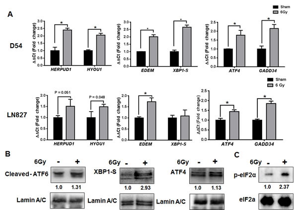 The observation of increased ER-chaperone expression, along with alterations in ER homeostasis, prompted us to examine the possibility that IR might be activating the ER stress response [23]. The ER stress response is regulated by three transmembrane proteins within the ER membrane: ATF6, IRE1 and PERK [11, 12]. To assay for activity of each pathway, we performed quantitative RT PCR (qRT-PCR) using primers specific for genes known to be downstream of each regulatory arm of the ERSR [23, 24]. For the ATF6 pathway, we assayed HERPUD1 and HYOU1 expression. For IRE1, we assayed EDEM and XBP1-S, and for PERK, we measured ATF4 and GADD34 levels. We found that IR (6 Gy) was associated with significant increases (P < 0.05) in expression of each of these genes in D54 and LN827 cells (Figure 2A). To validate our findings at the protein level, we assayed the expression of ATF6, XBP1-S and ATF4 in the nucleus of irradiated D54 cells. We found increased abundance of ATF6, XBP1-S and ATF4 48h after irradiation in nuclear fraction (Figure 2B). Furthermore, we examined the phosphorylation status of eIF2α, a proximal cytosolic target of activated PERK. We observed increased phosphorylation eIF2α 48h after irradiation (Figure 2C). Together, these findings support the notion that IR can promote mRNA and protein expression, which is consistent with activation of the ERSR in glioblastoma cells.
