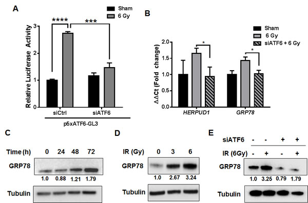 Figure 3: Activation of the ATF6 pathway in glioblastoma by ionizing radiation. A. Luciferase assay for ATF6 transcriptional activity. D54 cells were co-transfected with p5xATF6-GL3 and siRNA targeting ATF6. The cells were irradiated with 6 Gy and assayed for luciferase activity 48h after IR. The relative activity normalized to control is shown. B. qRT-PCR analysis of HERPUD1 and GRP78 expression in D54 after knockdown of ATF6. Cells were treated with ATF6 siRNA for 48h prior to irradiation with 6 Gy, and harvested 48h later. C. Western blot analysis of GRP78 in whole-cell lysates from D54 cells harvested at the indicated time-points after irradiation with 6 Gy. D. Western blot analysis of GRP78 in whole-cell lysates from D54 cells harvested 48h after irradiation with 3 and 6 Gy. E. Western blot analysis of GRP78 in whole-cell lysates from D54 cells treated with ATF6 siRNA and 6 Gy IR. Cells were harvested 48h after irradiation. Shown beneath the blots is the relative expression of the indicated proteins when compared to the respective untreated control. The values represent the normalized densitometric output for each band divided by the corresponding loading control. In all graphs, data shown are the Means ±SD (n = 3). *P < 0.05, ***P < 0.001, ****P < 0.0001.