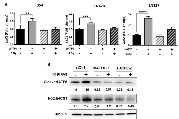 Figure 6: ATF6 contributes to regulation of NOTCH1 gene expression. A. qRT-PCR analysis of NOTCH1 expression in D54, LN428 and LN827. Cells were treated with siRNA targeting ATF6 for 48h prior to irradiation with 6 Gy. All qRT-PCR analyses were performed using cells harvested 48h after irradiation. B. Western blot analysis of cleaved-ATF6 and Notch-ICN1 in whole cell lysates of D54 harvested 48h after treatment with ATF6 siRNA and irradiation with 6 Gy. Shown beneath the blots is the relative expression of the indicated proteins when compared to the respective untreated control. The values represent the normalized densitometric output for each band divided by the corresponding loading control. In all graphs, data shown are the Means ±SD (n = 4). **P < 0.01, ***P < 0.001, **** P < 0.0001.
