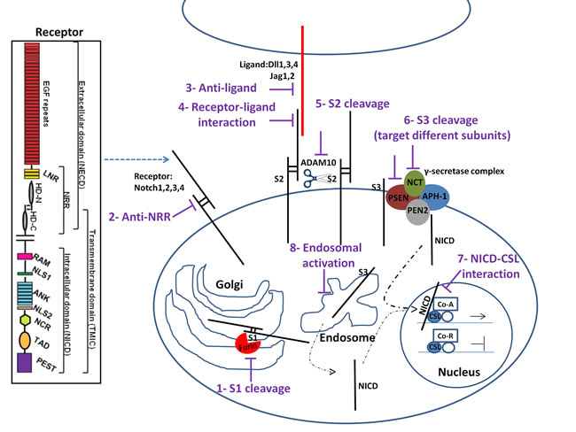 - Unresponsive receptor to ligand binding by targeting NRR in case of Notch1,2 and 3 - Blocking receptor–ligand interactions by hindering EGF repeats required for binding |
