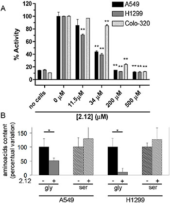 Figure 4: Inhibition of SHMTs activity in living cells. (A) SHMTs activity was measured in A549 and H1299 lung cancer cell lines and COLO320 colon cancer cell line after treatment with 2.12 at different concentrations. The inhibitory effect of 2.12 occurs in a dose dependent manner. The histogram represents mean ± standard deviation of two independent replicates. (** = P ≤ 0.001). (B) Gas-chromatography/mass-spectrometry semi quantitative evaluation of glycine and serine content in A549 and H1299 cells treated or not with 2.12 (25 μM for 24 h). The mean ± standard deviation of three independent experiments is shown in the histogram (* = P ≤ 0.05).
