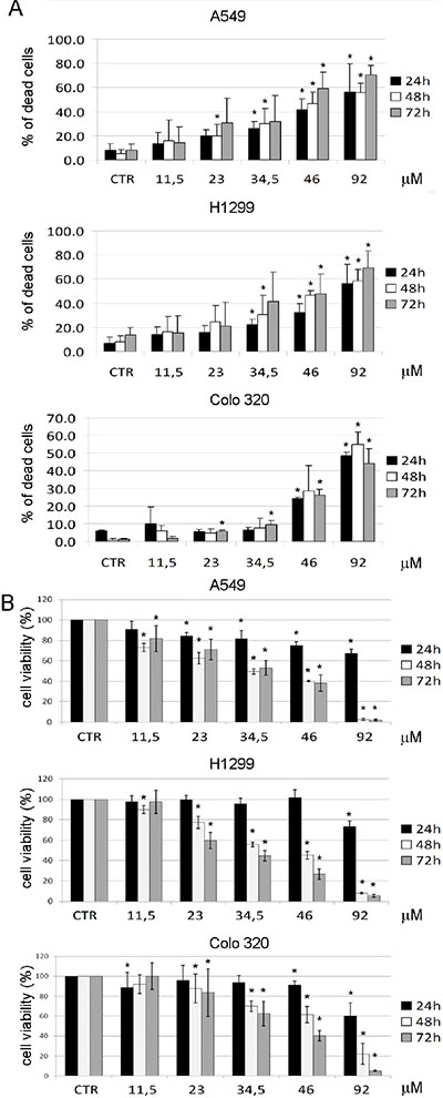 Figure 5: Cell death induction after treatment with 2.12. A549, H1299 and COLO320 cancer cell lines were treated for 24 h, 48 h and 72 h with increasing concentrations of 2.12 and cell death was evaluated by trypan blue exclusion assay (A) and XTT assay (B). All data represent mean ± standard deviation of at least 3 independent experiments. (* = P ≤ 0.05)