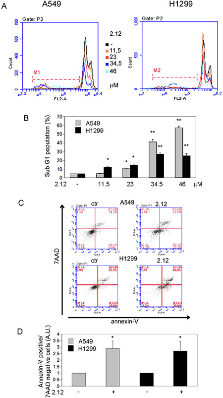 To clarify if the 2.12-mediated induction of lung cancer cell death is due to the activation of an apoptotic process, we used PI and Annexin-V staining. Figure 6A and 6B shows that 2.12 induces the accumulation of a subG1 population of A549 and H1299 lung cancer cells after 48 hours of treatment, clearly indicating an apoptotic phenomenon, with a strong induction (around 40% for A549 and 25% for H1299) at the concentration of 34 μM. Figure 6C and 6D shows the same cell lines after treatment with 2.12 (34 μM for 48 h) together with the control untreated samples, both stained with annexin-V. The accumulation of cells in the population Annexin-V positive/7-AAD negative after treatment with 2.12 confirms that the apoptotic mechanism is involved.