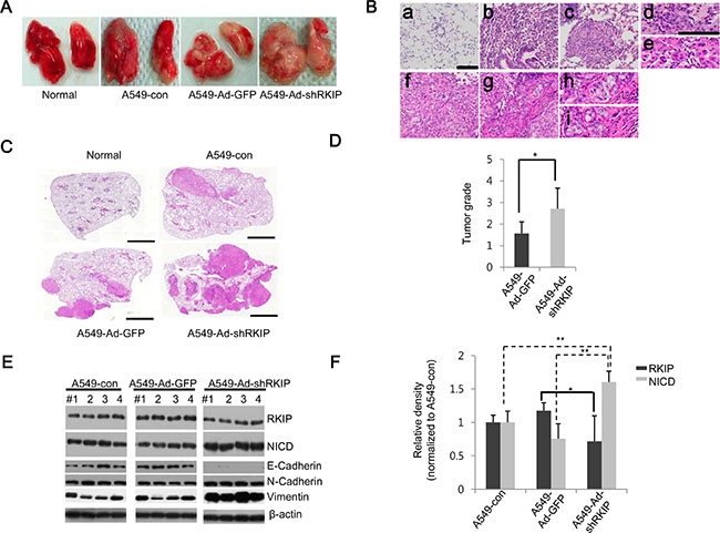 Figure 5: Knockdown of RKIP promotes tumor metastasis in vivo in orthotopic lung cancer mouse models. (A) Images of metastatic lungs. Lungs were extracted from BALB/c nude mice injected with 1 × 106 cells (per mouse) of A549 only (A549-con), A549 cells infected with Ad-GFP (A549-Ad-GFP), or A549 cells infected with Ad-shRKIP (A549-Ad-shRKIP) (n = 7 per group) and photographed to visually examine tumor nodules. Normal indicates non-treated mice. (B) Four-stage grading systems of lung adenocarcinoma. Based on tumor progression and histopathological phenotypes of H & E-stained tumor tissues, the lung cancer tissues were classified at four stage grades as follows: (a) normal lung tissue, (b) Grade 1 lesions of an atypical adenomatous hyperplasia (AAH) progressing to a small adenoma, (c) Grade 2 adenoma, (d) Grade 2 lesions form a solid tumor but have regular nuclei, (e) Grade 3 adenocarcinoma exhibiting enlarged pleomorphic nuclei and prominent nucleoli, (f) Grade 3 adenocarcinoma displaying mixed cellular phenotypes, (g) Grade 4 invasive adenocarcinoma, (h) Grade 4 adenocarcinoma with glandular/acinar architecture, and (i) Grade 4 adenocarcinoma with desmoplasia. Scale bar, 100 μm. (C) Representative H & E-stained lung tissues. Scale bar, 100 μm. (D) Distribution of tumor grades. Bars indicate the average values of four grades determined from tumor tissues for each mouse group. Data show mean ± S.D. *p < 0.05 (n = 7). (E, F) RKIP and NICD expression in lung adenocarcinoma tissues. (E) Total lysates of tumor tissues (four per group) were subjected to immunoblot analysis using the indicated antibodies. (F) Quantifications of RKIP and NICD expression levels represented graphically. Data indicate the mean values ± S.D. of three independent experiments. *p < 0.05; **p < 0.01.