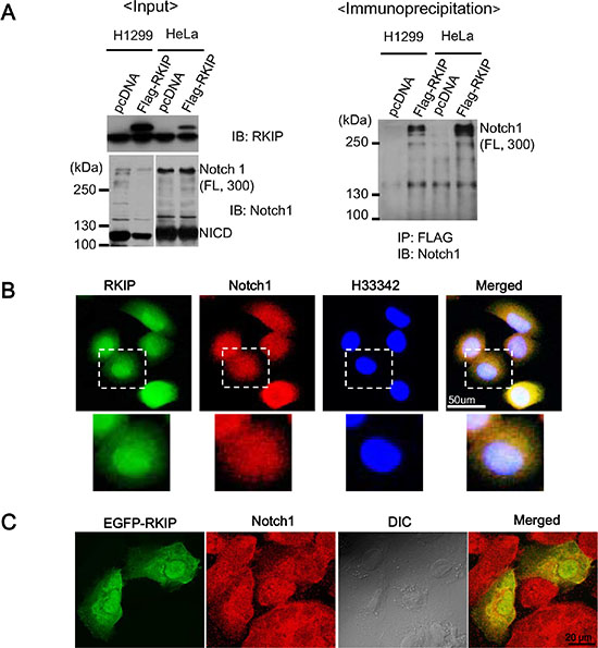 Figure 6: RKIP directly interacts with full-length Notch1. (A) The left panel indicates the input of RKIP and Notch1 in FLAG-tagged, RKIP-overexpressing cells. Total cell lysates (1 mg) of FLAG-tagged, RKIP-overexpressing H1299 or HeLa cells and control cells expressing pcDNA were immunoprecipitated (IP) using anti-FLAG antibodies (M2 beads), and the bound Notch1 proteins were detected by immunoblotting (IB) with anti-Notch1 antibodies. (B) Co-localization of RKIP and Notch1 using immunohistochemistry. FLAG-tagged, RKIP-overexpressing H1299 cells were fixed, stained with both FITC-conjugated anti-RKIP antibodies and Cy5-conjugated anti-Notch1 antibodies, and visualized under the fluorescent microscope. The nuclei were stained with H33342 dye. White dotted boxed regions correspond to the higher magnification images below. (C) Co-localization of EGFP-RKIP and Notch1. EGFP-tagged, RKIP-overexpressing H1299 cells were fixed, stained with both GFP and Cy5-conjugated anti-Notch1 antibodies, and visualized under the fluorescent microscope.