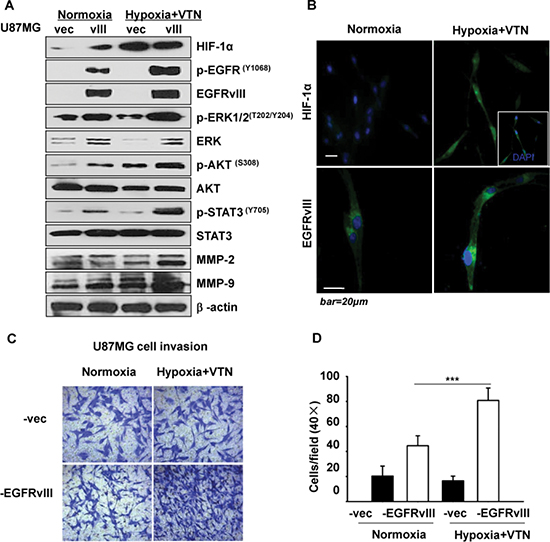 Figure 1: Effect of hypoxia and vitronectin microenvironment on U87MG-EGFRvIII cells. (A) The specific microenvironment promoted significant activation of EGFRvIII and downstream signaling in U87MG-EGFRvIII but not vector cells. (B) Immunofluorescence showed greatly enhanced p-EGFRvIII expression in response to a hypoxia & vitronectin (VTN) cell cultural conditions in U87MG-EGFRvIII cells. (C) U87MG-EGFRvIII cells had significantly more enhanced invasion in response to the microenvironment than vector cells by Transwell invasion assays. (D) Quantification of the cell invasion rates in (C). Values are the mean and SEM of 5 independent determinations; data are representative of at least 3 independent experiments. ***p < 0.001.